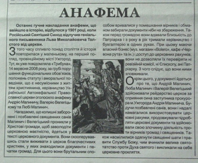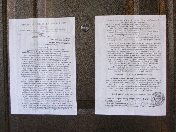 9 жовтня до відома усіх людей на дверях каплиці Св. Андрія було розміщено копію церковної анафеми на Андрія Малинича та Валерія Велегіцького.