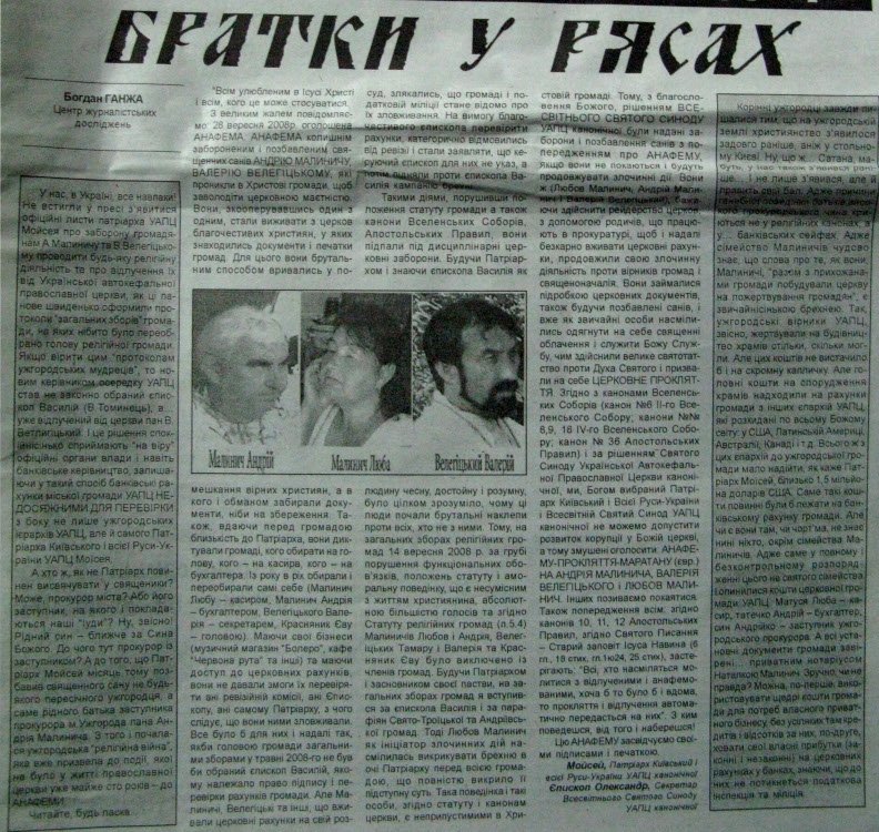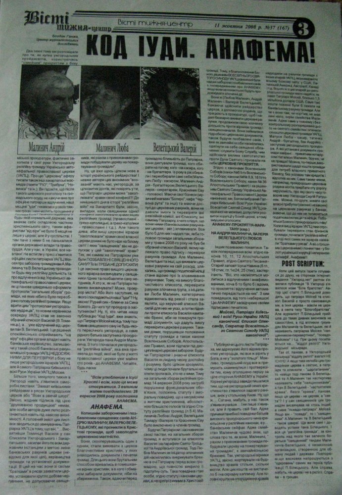 Родина Малиничів з В. Велегіцьким намагаються викрасти – рейдувати в м. Ужгороді Божі церкви. Документи на наші громади хитрістю вони вже частково присвоїли собі, що нам і підтвердили представники управління внутрішньої політики Закарпатської облдержадміністрації.