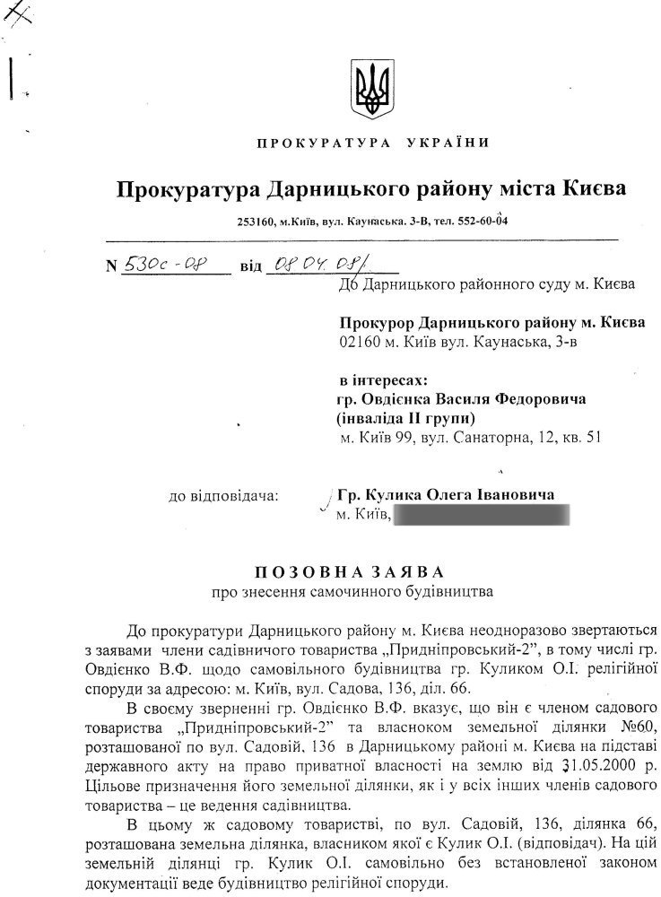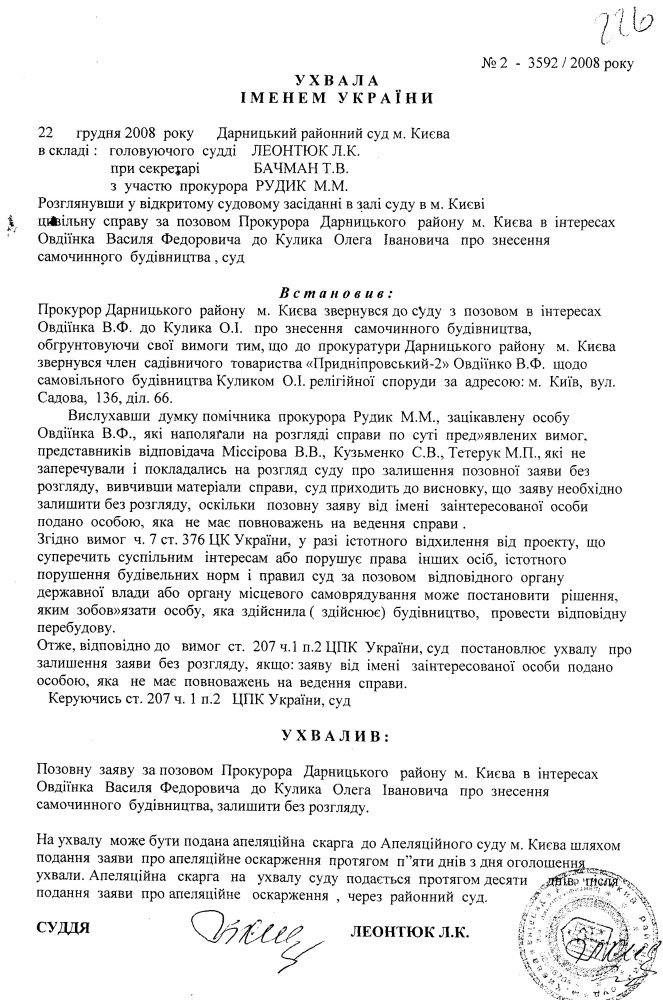 Голова Дарницького районного суду Леонтюк Л.К. Ухвалою від 22 грудня 2008 року залишила без розгляду позовну заяву прокурора Дарницького р-ну м. Києва до Патріарха Мойсея (Кулика О.І.), оскільки відповідно до ч.1 п.2 ст. 207 ЦПК України прокурор не мав права подавати заяви в інтересах зацікавленої особи – Овдієнка В.Ф.