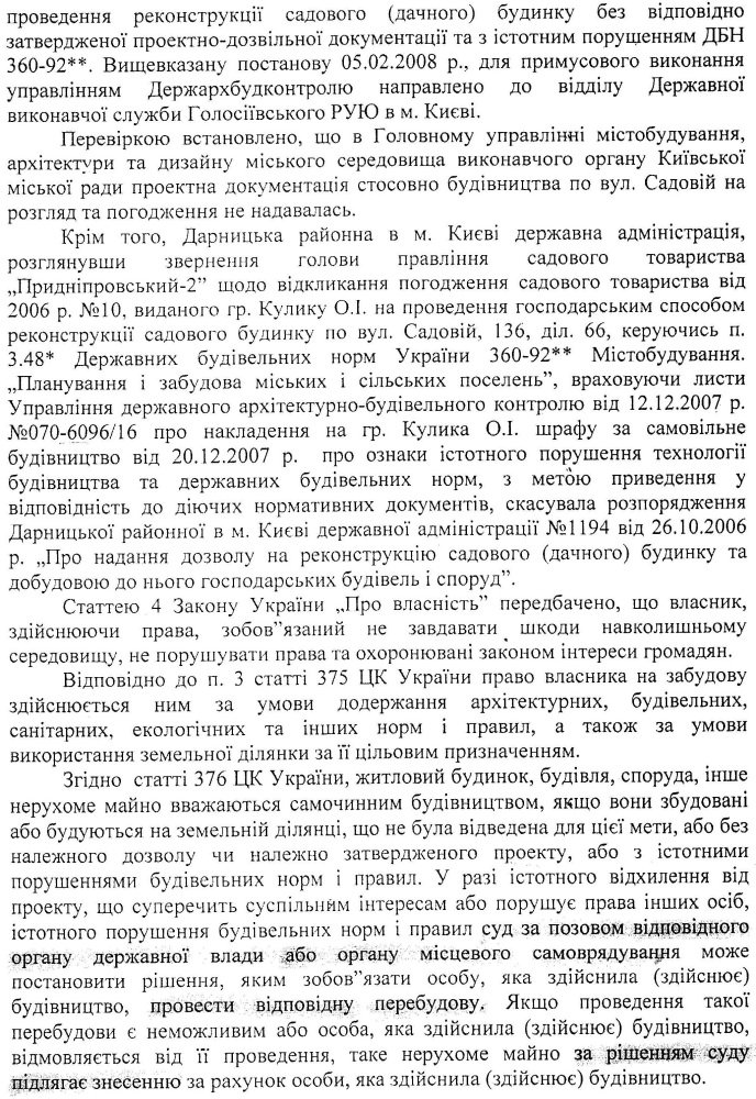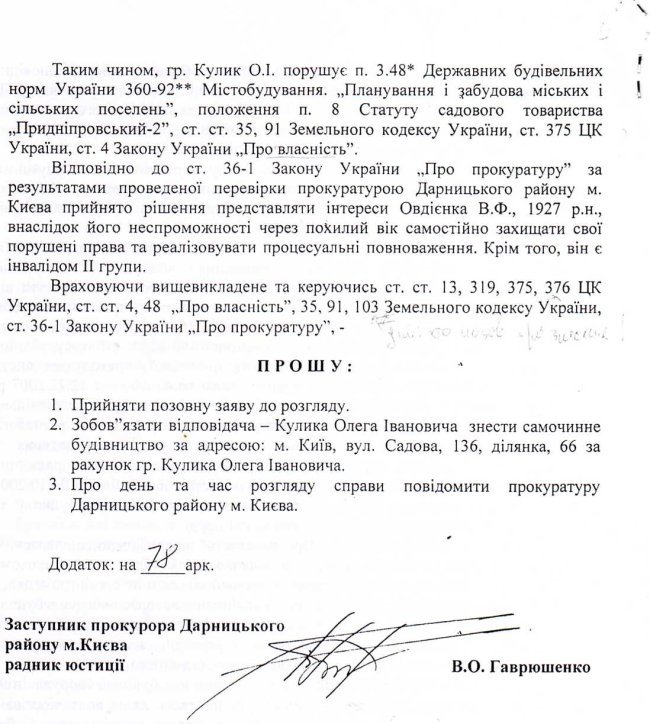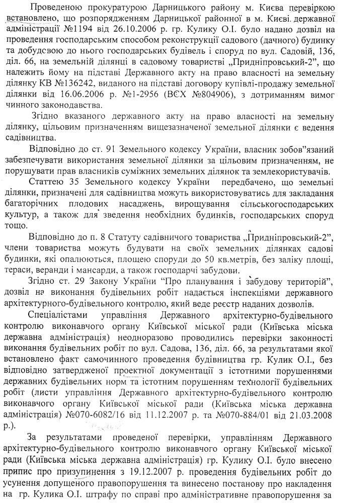 Справу розглядала суддя Цимбал І.К., яка всіляко намагалася догодити позивачам по справі – представникам Дарницької прокуратури і Київської міськради. Як докази у справі, подані позивачами, виступає статут садового товариства “Придніпровський-2”, який ще за радянських часів зобов’язував власників ділянок зводити будівлі площею не більше 50 кв. м. У процесі розгляду справи з’ясувалося, що оригіналу статуту садового товариства давно немає, тож він не може виступати належним доказом у справі. І власники інших будівель, які також входять до садового товариства, давно вже не дотримуються положень застарілого статуту і безперешкодно продовжують будувати навколо приватні будівлі площами не менше 200 – 500 кв. м.