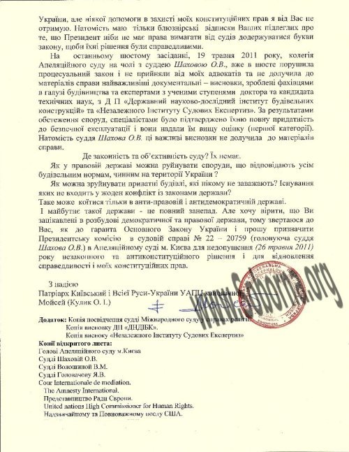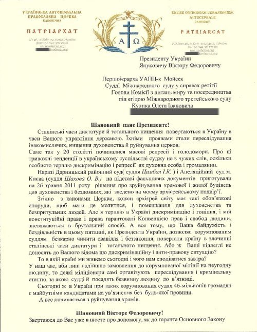 Згідно з канонами Церкви, кожен архієрей світу має такі обов’язкові споруди, щоб мати де молитися, і помешкання для духовенства та безпритульних людей. Але я терплю в Україні дискримінацію і гоніння, і мої конституційні права і права гарантовані Конвенцією прав і свобод людини, зневажаються в брутальний спосіб. А все тому, що Ваша байдужість і бездіяльність в цьому питанні, як Президента України, дозволяє корумпованим суддям безкарно чинити свавілля і беззаконня, повертати країну в злочинні сталінські часи диктатури і тотального нищення. Або ж Ваші підлеглі не доносять до Вашого відома цю дискримінаційну і анти-правову ситуацію?